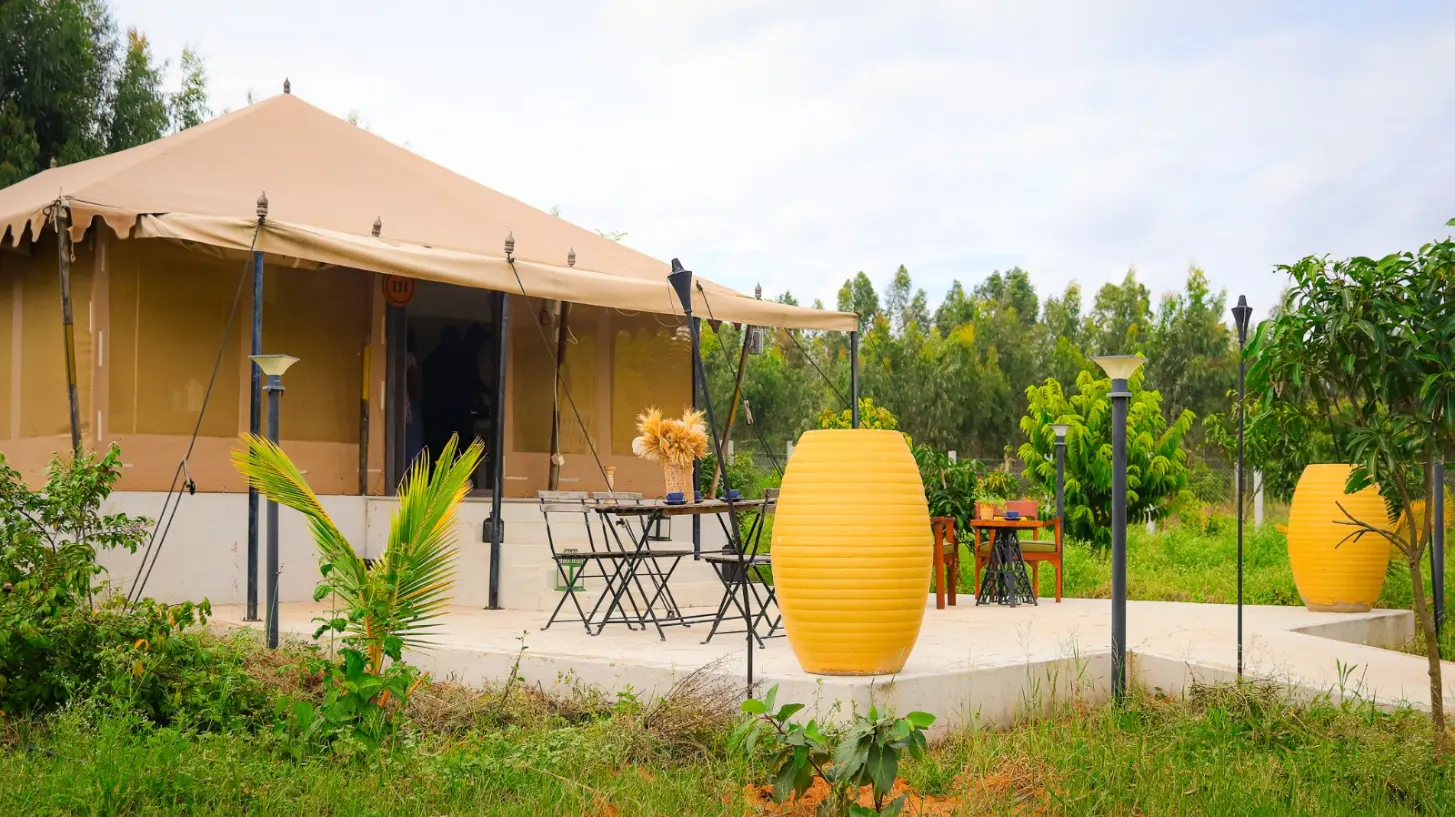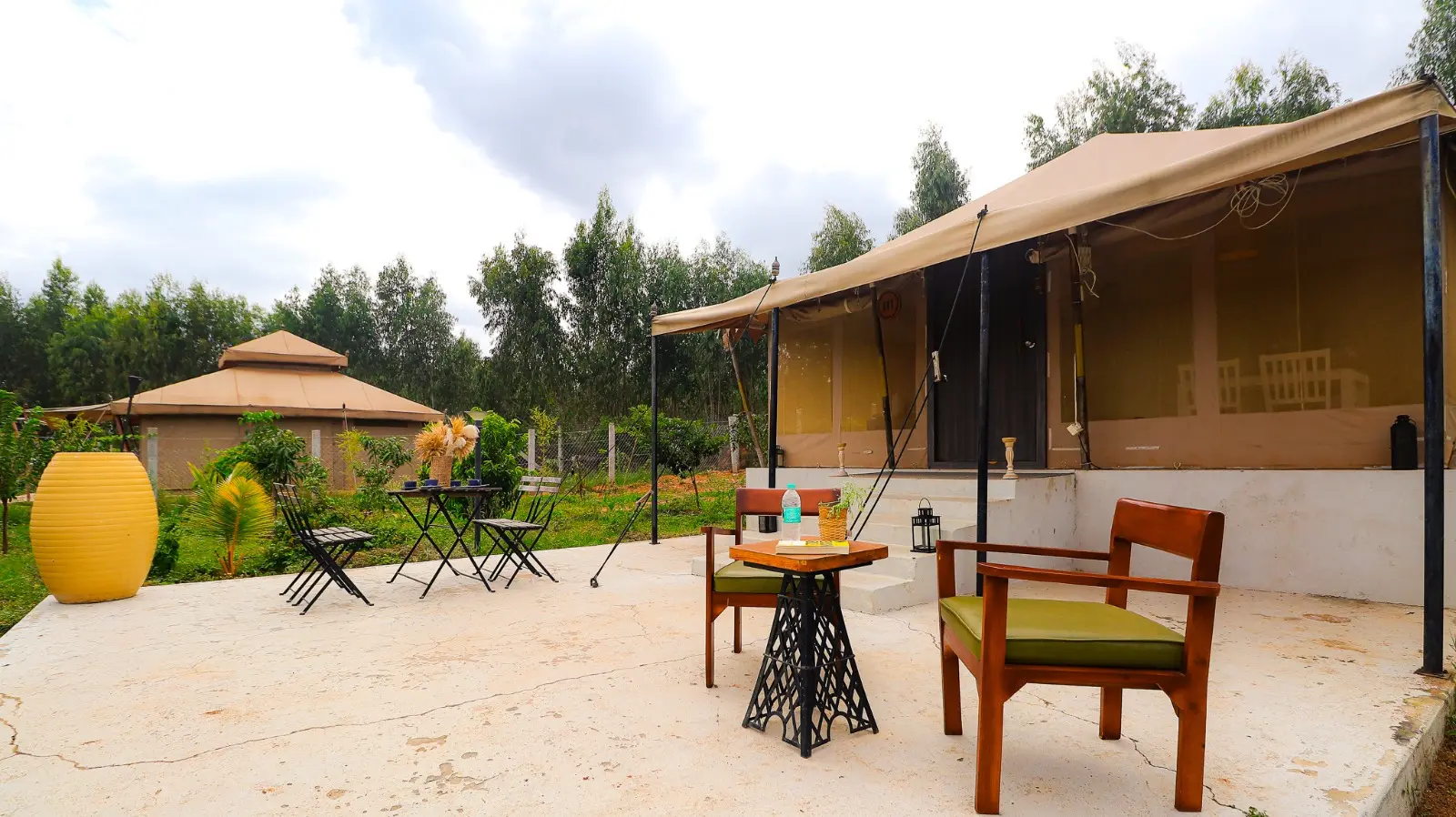 The African 1BHK Safari Tent brings the spirit of the wild into your stay, combining earthy tones, natural textures, and an open-to-nature design that captures the essence of safari living. Spread across 600 sq. ft., this spacious tent includes one bedroom, a large bathroom, and a comfortable living and dining area, creating the ideal countryside retreat for couples or small families.