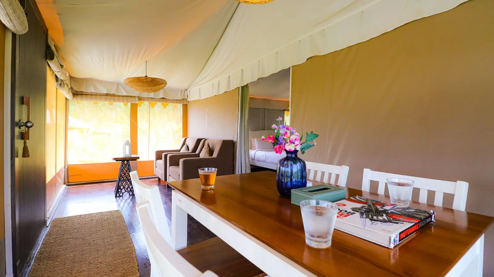 Blending royal elegance with delicate design, the Maharani Tent features two refined bedrooms, spacious living and dining areas, and a private covered sit-out. With garden views, a private bonfire pit, and exclusive garden access, it offers families and groups a serene yet luxurious countryside retreat.
