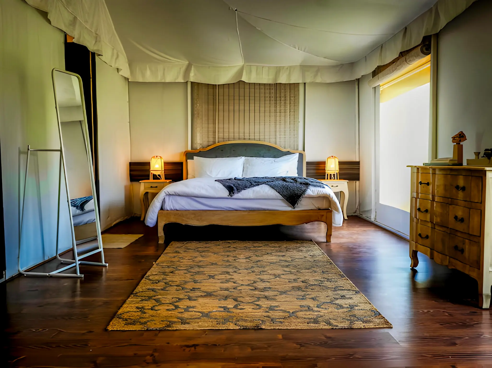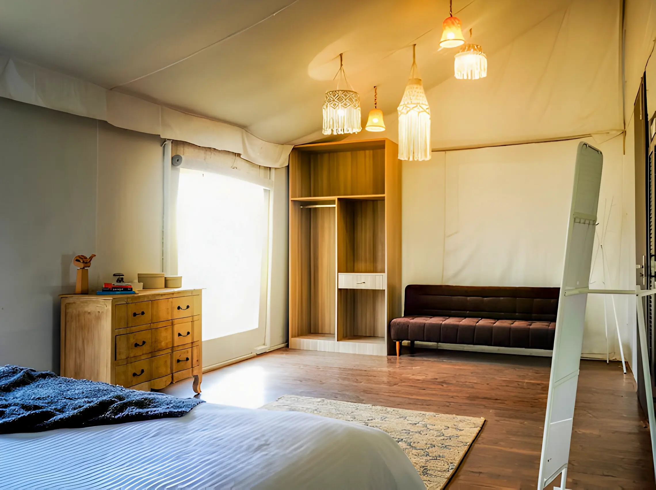 The Maharaja 2BHK Tent evokes royal grandeur, inspired by Rajasthani haveli design and heritage living. Spanning 1,500 sq. ft., it features two spacious bedrooms, two bathrooms, and elegant living and dining areas that bring regal charm into the countryside. Rich furnishings and spacious interiors create an ambiance of luxury, while every corner is designed for comfort and elegance.