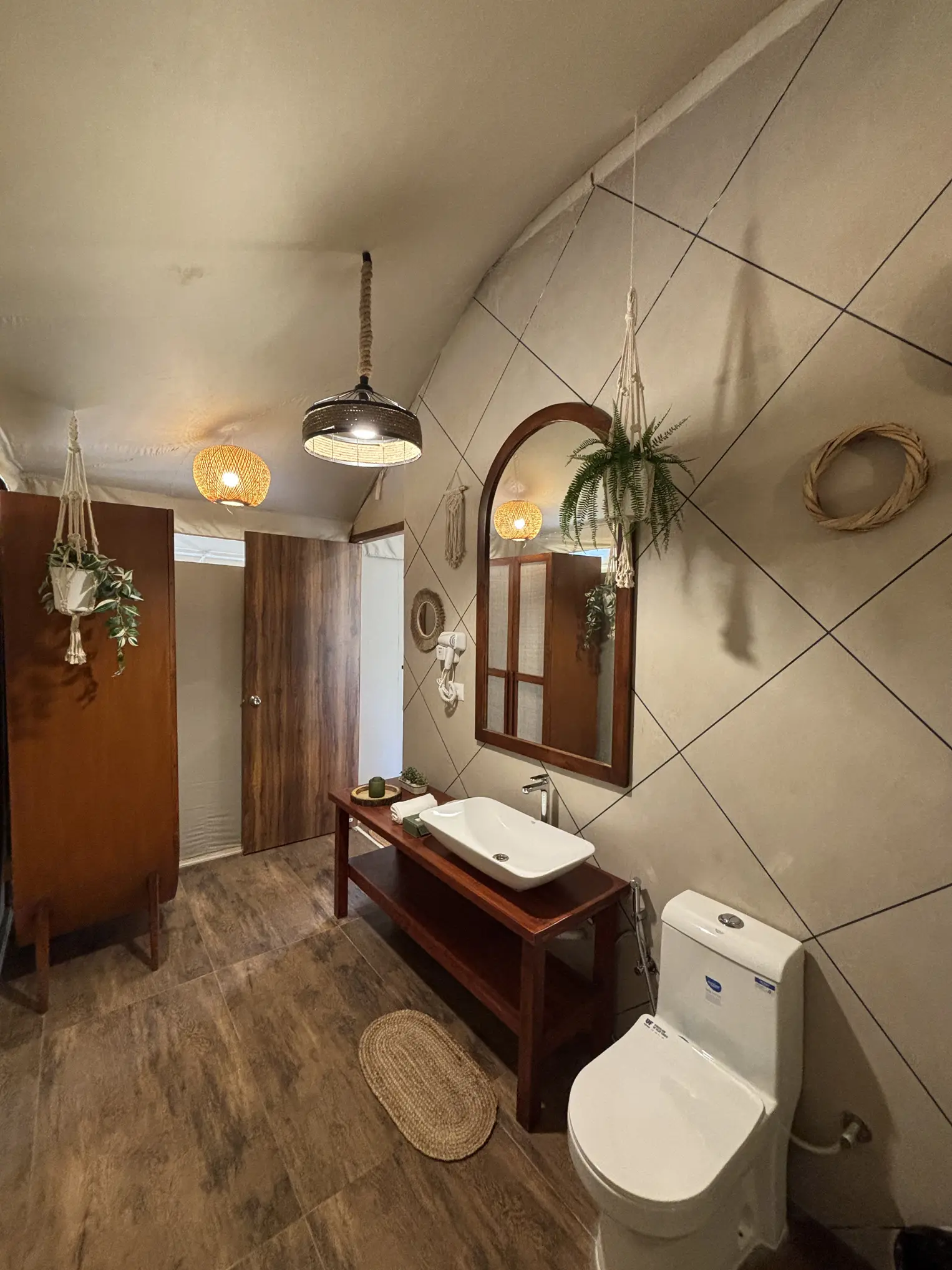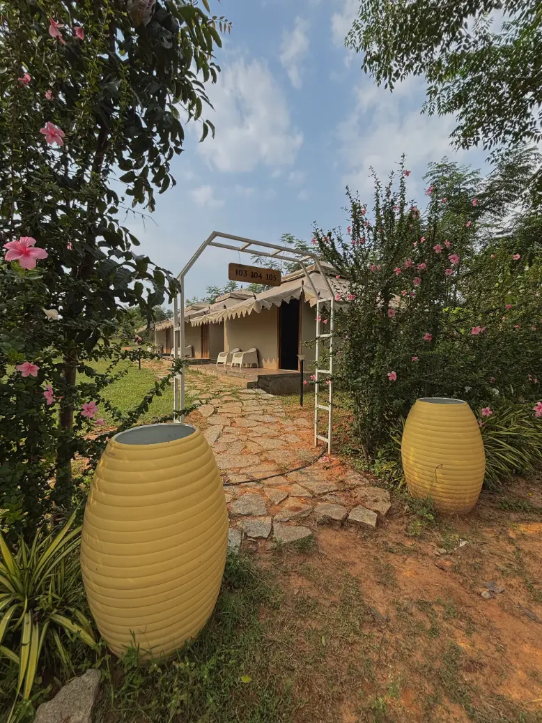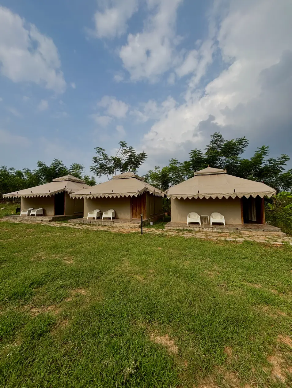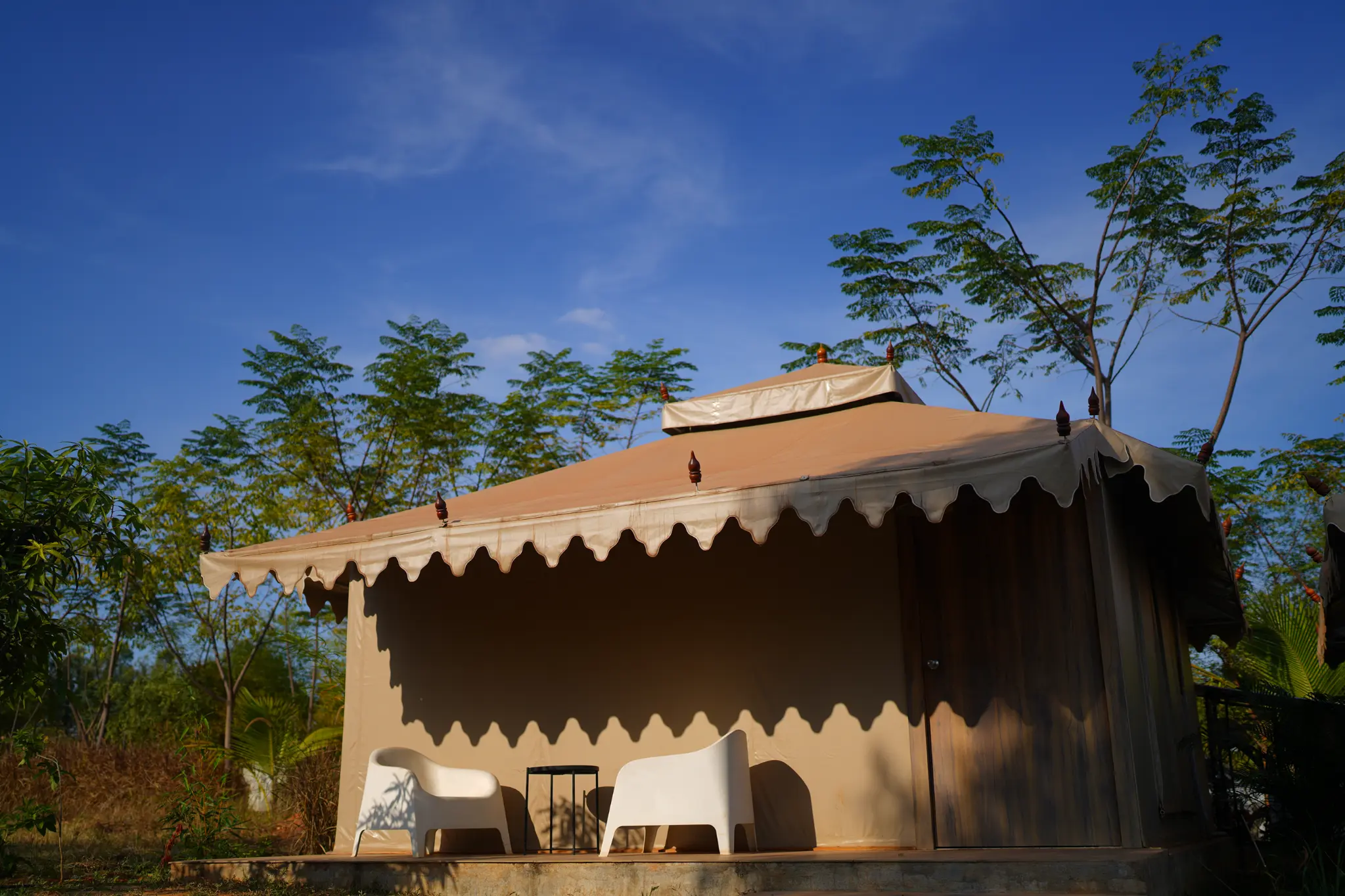 The Samrat Studio Tent at Serenity Retreat offers a harmonious balance of simplicity and comfort, making it the perfect countryside escape for solo travelers and couples. Designed with wabi-sabi inspiration and rustic charm, this 350 sq. ft. studio-style tent features a well-appointed bedroom with an attached bathroom, blending earthy tones with minimal elegance to create a calming retreat. Step outside to a private sit-out that opens into lush gardens, where mornings begin with sunrise views and evenings close with starlit skies. Compact yet thoughtfully detailed, the tent is designed to maximize coziness while providing modern comforts, making it an intimate hideaway for those seeking tranquility and connection with nature.